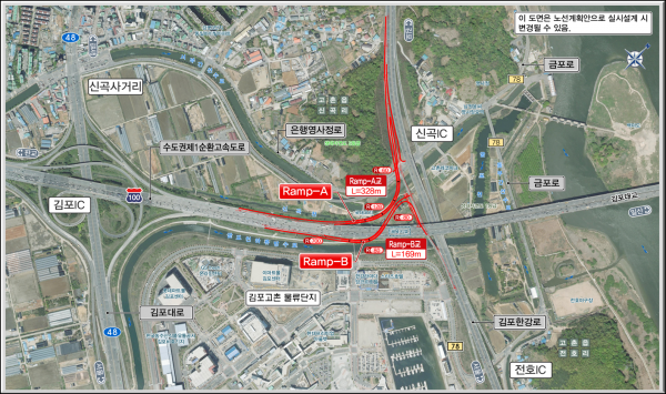 ‘수도권 제1순환선 김포영사정IC 연결로 설치사업’은 김포한강로 신곡IC와 수도권 제1순환선을 연결하는 사업으로 김포한강로에서 수도권 제1순환선 판교방향으로 진입 수도권 제1순환선에서 김포한강로 김포방향으로 진출할 수 있는 연결램프 2개소를 총사업비 315억원을 투입, 총연장 2.04㎞, 도로폭 8.1m의 편도 1개 차로 규모로 건설될 계획이라고 전했다.