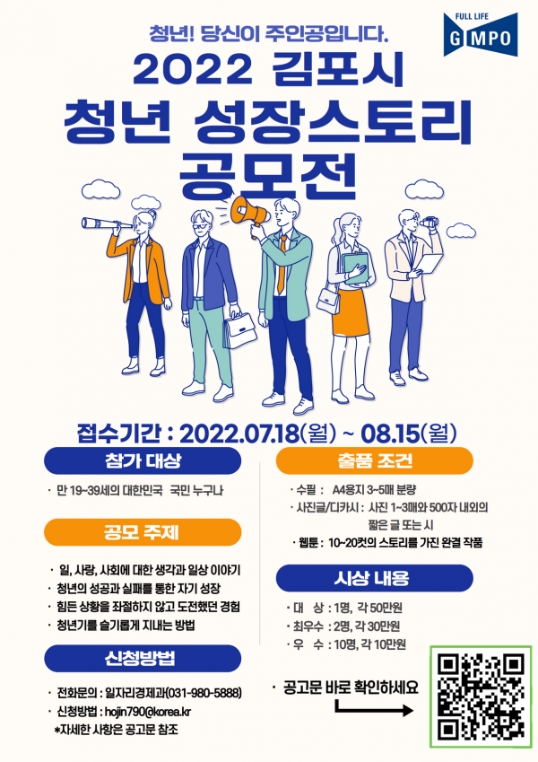 황규만 일자리경제과장은 “청년이 살기 좋은 젊은 김포를 만들기 위해서는 청년들의 다양한 생각과 의견이 청년정책에 반영되어야 한다며 이번 공모전에 많은 청년들이 관심을 갖고 적극적으로 참여해 주시길 바란다”고 말했다