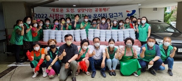 이번 사업은 지난 6월 20일 계절김치 만들기 행사에 일환으로 끓인 소금물에 절여 둔 오이가 알맞게 발효 숙성돼 개별 포장 후 지역소외계층 500세대에 각각 전달했다.