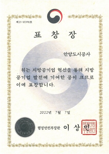 안양도시공사는 코로나19 장기화의 어려운 상황 속에서도 청년·희망일자리 창출 첨단기술 융합 시설물 관리 고객참여 소통 플랫폼 확대 인권·윤리경영 강화를 통한 청렴 조직문화 정착 일·가정 양립 조직문화 확산 등 ‘적극행정 및 경영혁신’을 적극 주도한 공로를 인정받았다.