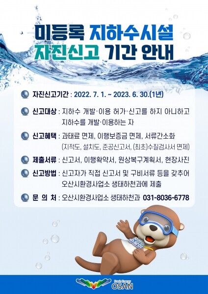 또한 오산시는 환경부와 한국수자원공사가 주관하는 ‘2022년 미등록 지하수시설 전수조사 사업’ 대상지로 선정되어 올해 5월부터 10월까지 전문 조사 업체를 통해 전수조사를 시행하고 있다.