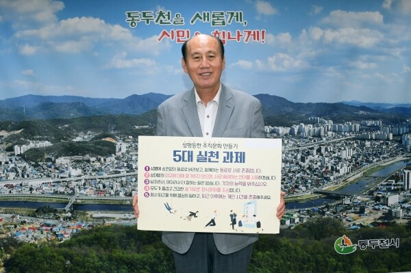 동두천시에서 선정한 5대 실천과제는 “1.성별에 상관없이 동료로 바라보고 함께하는 동료로 서로 존중한다 2.상대방의 외모에 대해 평가하지 않으며 서로 배려하는 언어를 사용한다 3.남자라서 여자라서 더 잘하는 일은 없다 각자의 능력을 봐주십시오. 4.모두가 즐겁고 건강한 슬기로운 회식문화를 조성한다 5.정시 퇴근을 위해 열심히 일하고 퇴근 이후에는 개인시간을 존중해주세요.”라는 내용을 담았으며 전 부서장과 직원들은 챌린지를 통해 건강하고 행복한 직장생활을 할 수 있는 평등한 조직문화 만들기에 서로 노력하기로 다짐했다.