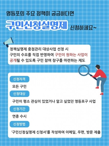 구민이라면 누구나 ‘구민신청실명제’를 활용해 평소 알고 싶었던 영등포구 사업에 대해 공개 신청이 가능하다.