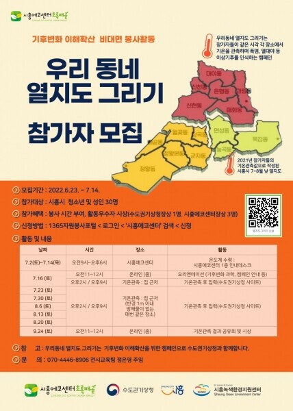 수도권기상청에서 2019년부터 시작해 올해 4년째 실시 중인 우리 동네 열지도 그리기는 7월 16일 오리엔테이션을 시작으로 8월 20일까지 토요일마다 오후 2시, 오후 9시 2회 관측을 하고 9월 24일 결과 공유회로 마무리할 예정이다.