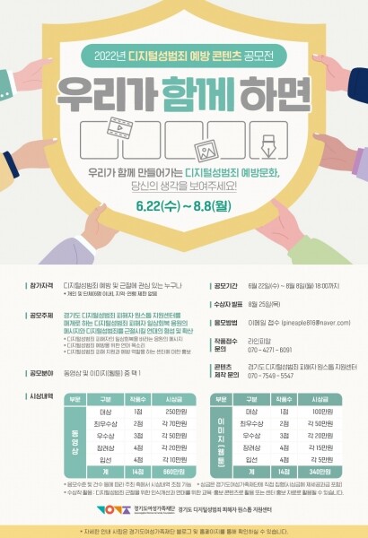 백미연 경기도디지털성범죄피해자원스톱지원센터장은 “디지털 성범죄는 ‘놀이’가 아닌 ‘범죄’라는 인식 확산을 목적으로 공모전을 기획했다”며 “2022년 디지털 성범죄 예방 콘텐츠 공모전에 많은 도민의 참여를 바란다”고 말했다.