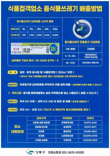 음식물쓰레기 무상수거 사업이 종료됨에 따라, 2022년 7월부터는 200㎡ 미만 식품접객업소는 업소용 음식물쓰레기 전용용기에 납부필증을 부착해 저녁 8시부터 새벽 4시까지 내 점포 앞에 배출 해야한다.