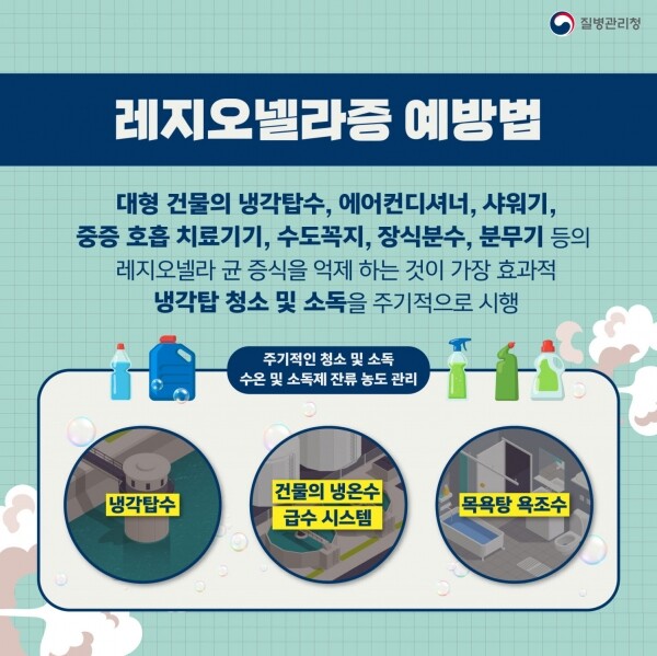 레지오넬라증은 레지오넬라균 감염에 의한 급성 호흡기 질환으로 오염된 물 속의 균이 비말 형태로 인체에 흡입되어 전파되므로 냉각탑 및 급수시설 청소 및 소독 관리 등 주의가 필요하다.
