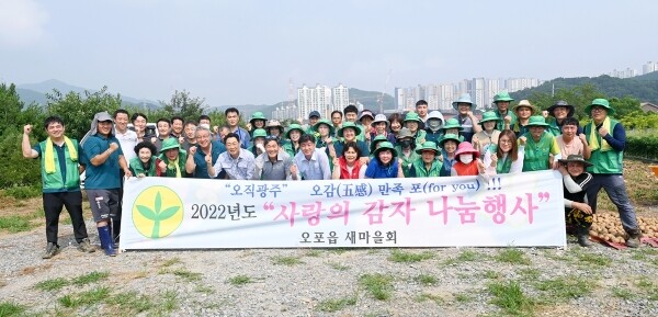 이날 수확 행사에는 방세환 시장을 비롯해 오창준 도의원, 황소제·조예란 시의원, 김형철 오포농협조합장, 기관단체장, 남·녀 새마을지도자 등 50여명이 참여해 오포읍 매산리 소재 농경지에서 지난 3월부터 정성스레 키워온 감자 250상자를 수확했다.