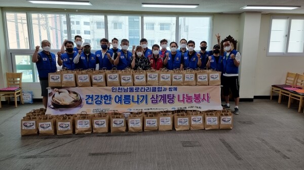 인천남동로타리클럽은 폭염 속에서 취약계층이 건강한 여름을 보낼 수 있도록 삼계탕을 비롯한 건강에 좋은 제철 과일 두유를 포함한 꾸러미를 포장했다.