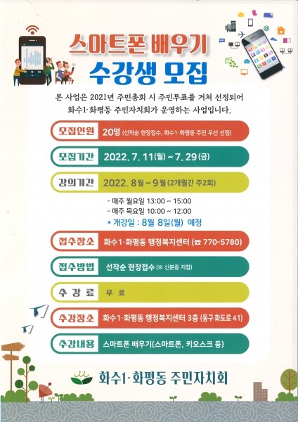 2022년 주민참여예산 사업으로 추진되는 이번 강의는 일상적으로 사용하는 스마트폰이나 키오스크 활용에 어려움을 겪는 주민들을 위해 주민자치회 교육환경분과에서 제안한 사업이다.