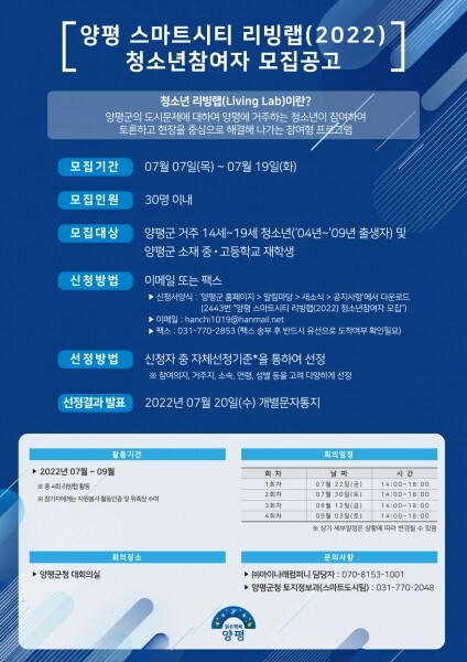 이번 스마트시티 리빙랩은 기존과는 달리 양평군에 거주하는 청소년들이 방학을 이용해 스스로가 생각하는 스마트도시의 모습을 상상하고 대안을 직접 만들어보는 체험과 참여를 동시에 실행할 수 있는 기회를 제공한다.