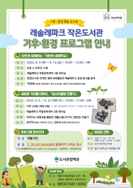 프로그램 접수는 7월 20일 수요일 오전 9시부터 선착순으로 모집하며 의왕시 중앙도서관 홈페이지 또는 모바일에서 신청하면 된다.