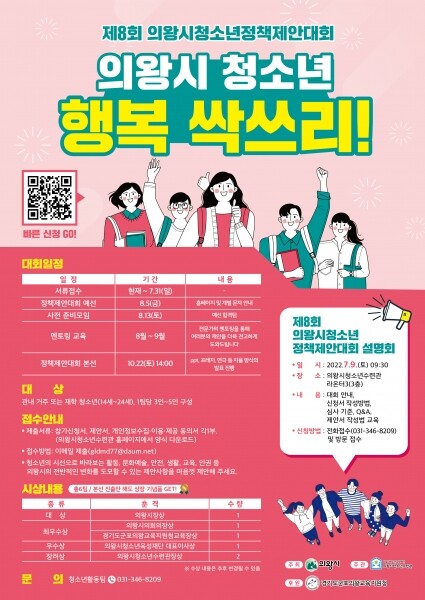 올해 8번째로 진행되는 청소년정책제안대회는 청소년 시선으로 바라보는 청소년 활동, 문화예술, 안전, 생활, 교육, 인권 등 우리 생활 전반에서 의왕시가 행복한 청소년 도시로 거듭나기 위한 기발한 아이디어를 제시하는 대회이다.