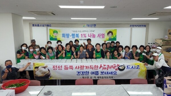 박충선 대신면장은 “대신면 남·녀 새마을지도자회와 주민자치위원회의 사랑을 담은 삼계탕이 무더위로 인해 지쳐계셨을 어르신들의 몸과 마음을 회복하는 데 큰 도움이 됐을 거라고 생각한다, 앞으로도 관내 독거노인 어르신들은 물론 다양한 취약계층의 안부를 살필 수 있도록 노력하겠다”고 밝혔다.