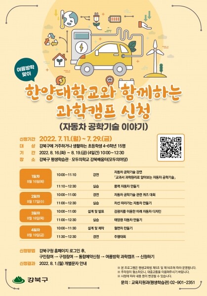 캠프는 강북구 평생학습관에서 8월 16일부터 19일까지 4일간 진행하며 강북구에 거주하거나 생활하는 초등학교 4학년~6학년 학생 15명을 대상으로 한다.