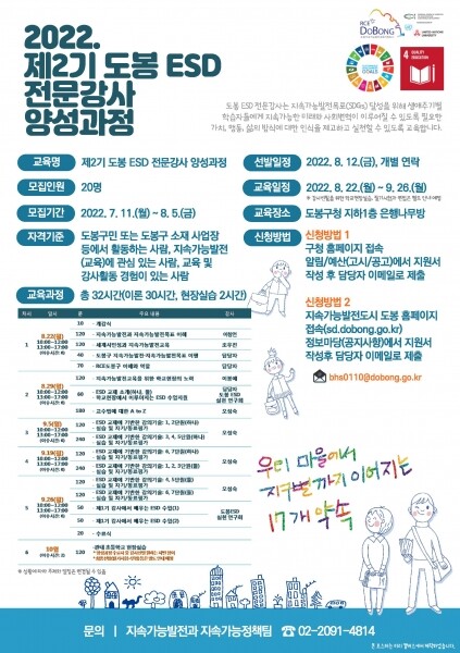 오언석 도봉구청장은 “기후 위기와 불평등 심화로 인해 지속가능발전교육의 중요성이 대두되고 있는 지금, 많은 분들께서 ‘제2기 도봉 ESD 전문강사 교육과정’에 참여하시어 지속가능발전의 가치와 의미를 함께해주시길 바란다”고 밝혔다.