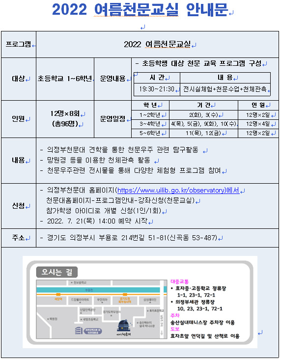 뜨거운 여름방학에 우주를 향한 더욱 뜨거운 시선으로 함께할 초등학생들의 많은 참여를 바라며 자세한 내용은 의정부천문대 홈페이지