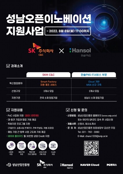 ‘2022 성남 오픈이노베이션’은 성남시 소재 중소벤처기업에 대한 종합적이고 체계적으로 지원하고 있는 성남산업진흥원과 SK C&C, 한솔PNS IT서비스부문이 함께 혁신적인 기술력과 아이디어를 창출하는 창업기업과 협업해 새로운 가치를 만들어 내는 사업이다.