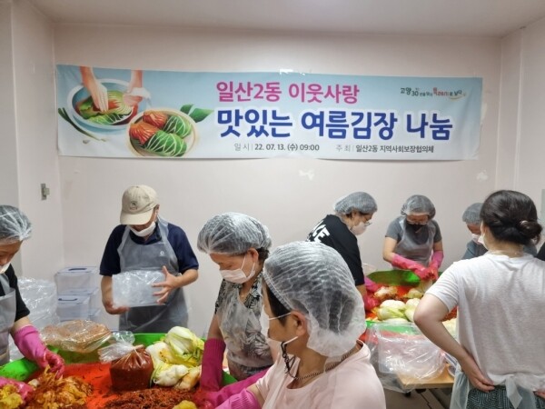 일산2동 행정복지센터는 겨울 김장이 떨어지는 시기에 물가상승으로 어려움을 겪고 있을 취약계층에 먹거리를 지원함으로써 건강한 일상생활 유지에 기여하고자 작년에 이어 올해 두 번째로 ‘맛있는 여름 김장 나눔 행사’를 특화사업으로 진행했다.