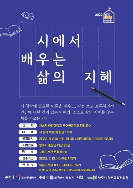 시 도서관 관계자는 “한 편의 좋은 시를 읽는다는 것은 영혼의 항아리 속에 향기로운 꽃을 꽂아두는 것과 같다는 이어령의 말처럼 양주시민들이 시를 읽고 써보면서 메마른 영혼이 한층 더 향기로워지는 기회가 되길 바라며 잃어버린 시적 감성을 찾아 다시 행복해지기를 바란다”고 전했다.