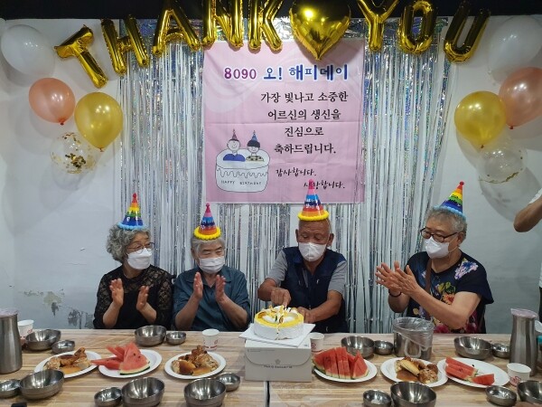 ‘8090 오해피데이’ 생신 축하연은 지월리 소재 음식점에 팔순과 구순을 맞이한 어른신을 축하 장식으로 맞이한 후 여름 건강식 삼계탕을 준비해 케이크와 함께 축하 팡파레를 울렸다.