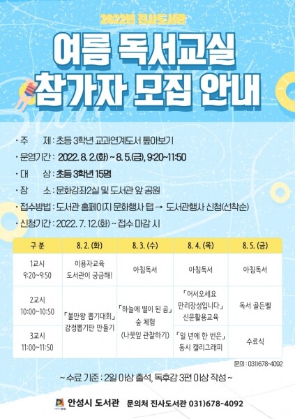 7월 12일부터 관내 초등학교 3학년 총 15명을 선착순으로 모집하고 있으며 참여를 원하는 자는 안성시 도서관 홈페이지에서 온라인으로 신청하면 된다.