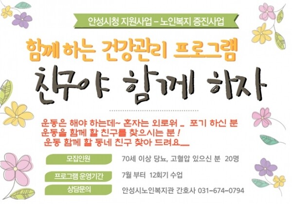 김동선 안성시노인복지관장은 “생활 속에서 관리와 주의를 기울여야 하는 만성질환을 가진 분들께 체계적이고 전문적인 건강관리 서비스를 제공해 건강한 노년생활을 돕고자 한다”며 “지난 11일부터 오는 20일까지 총 20명을 모집하고 있다”고 말했다.
