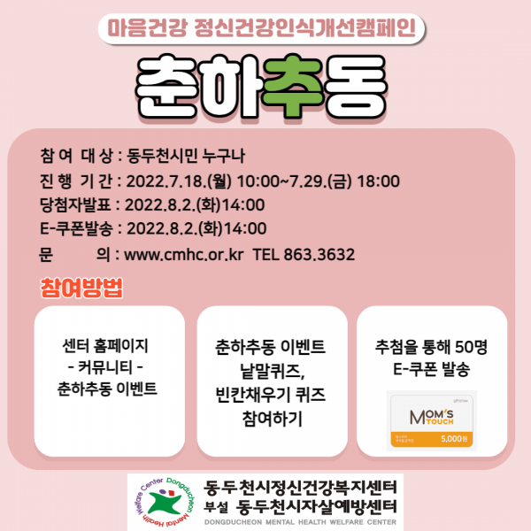 참여 방법은 오는 18일부터 29일까지 정신건강복지센터 홈페이지에 접속해 ‘춘하추동’ 이벤트 알림창을 참조하면 되며 시민 누구나 참여할 수 있다.