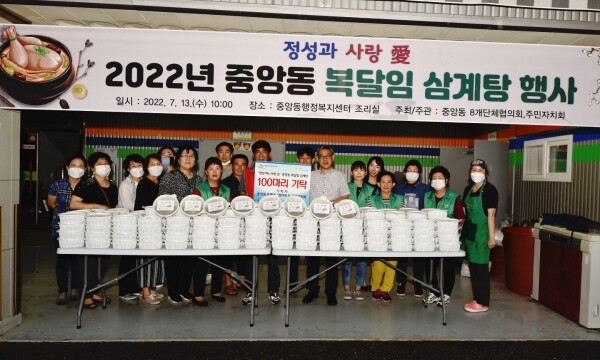 신선교 중앙동장은 “닭을 준비하고 완성되기까지 오랜 시간과 정성이 걸림에도 불구하고 많은 양의 삼계탕을 기탁해주셔서 감사드린다”며 “무더위에 지친 어르신들 등 관내 취약 계층에게 큰 힘이 될 수 있을 것 같다”고 전했다.