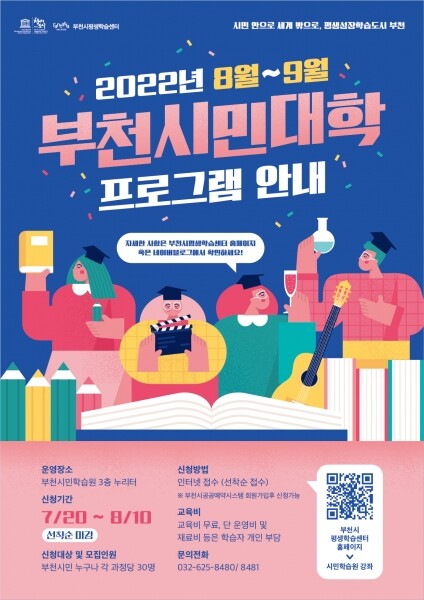 부천시민대학 프로그램 접수는 7월 18일부터 8월 10일까지 부천시평생학습센터 홈페이지를 통해 강좌별 30명씩 온라인으로 선착순 접수한다.