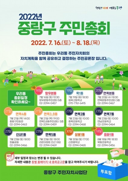 류경기 중랑구청장은 “우리동네에 필요한 사업을 정하고 자유롭게 제안할 수 있는 주민총회에 구민 여러분의 많은 관심을 부탁드린다”며 “지역사회 직접민주주의의 중요한 발판인 주민자치회를 확대해 내년에는 모든 동에서 운영될 수 있도록 최선을 다하겠다”고 말했다.
