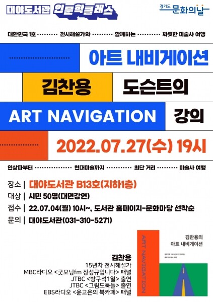‘아트 내비게이션’을 주제로 한 강연은 국내 1호 전시해설가 김찬용 씨가 맡아 시민들을 미술의 세계로 안내할 예정이다.