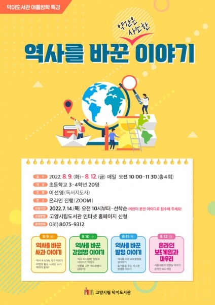 덕이도서관 문화행사 담당자는 “여름방학 특강과 함께 관련 도서 전시를 어린이 자료실에서 운영할 예정이다 책과 함께 배우고 읽고 생각하는 유익한 시간이 되길 바란다”고 밝혔다.