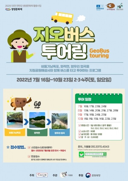 ‘지오버스투어링’은 오는 16일부터 10월 23일까지 매달 2·3·4주 토·일요일에 운영하며 비둘기낭폭포, 화적연, 멍우리 협곡 등을 지질공원해설사와 함께 이동하며 투어하는 프로그램이다.
