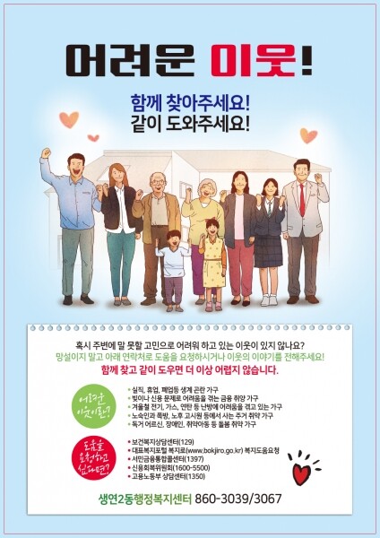 동 관계자는 “포스터를 통해 발굴된 위기가구는 상담을 통해 긴급지원, 공적 급여 지원 및 민간자원 연계, 사례관리 등 맞춤형 통합 서비스를 제공하겠다”고 밝혔다.