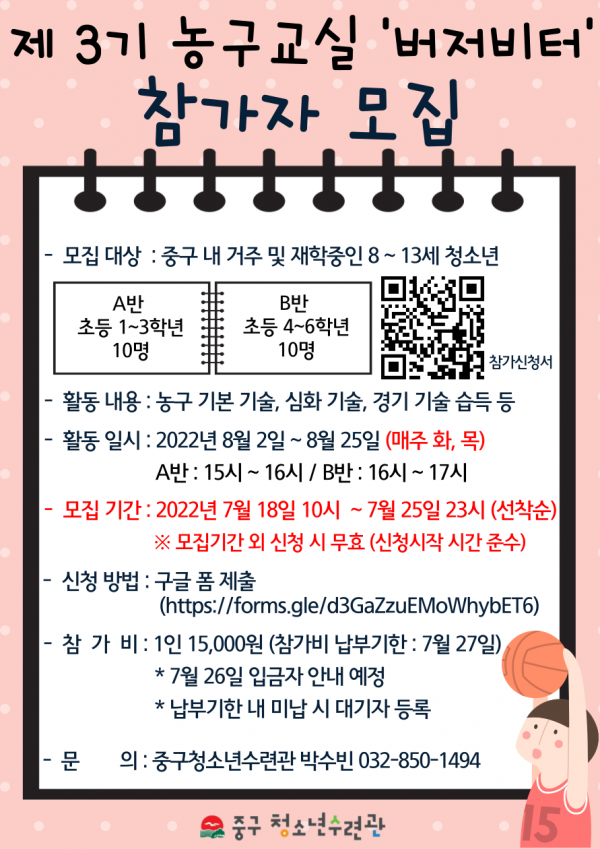 ▲ 2022년도 중구청소년수련관 농구교실‘버저비터’참가자 모집