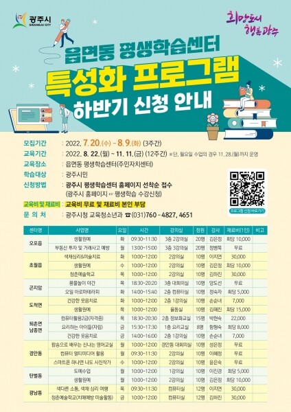 하반기 읍·면·동 평생학습센터 특성화 프로그램은 지역 특성을 반영한 차별화된 평생학습 프로그램 운영과 시민들의 배움의 가치를 실현하기 위해 추진하며 운영 장소는 오포·초월·곤지암읍·도척·퇴촌남종면·경안·탄벌·광남2동 등 8개 평생학습센터로 프로그램 수요 조사 시 신청해 선정됐다.