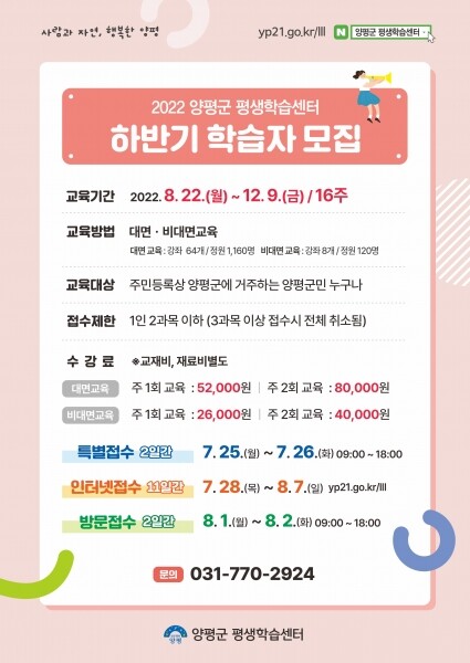 일반 주민은 오는 28일부터 다음달 7일까지 양평군 평생학습센터 홈페이지에서 본인인증 후 수강 신청할 수 있고 인터넷신청이 어렵거나 휴대폰이 본인명의가 아니라면 8월 1일과 2일 이틀간 평생학습센터로 방문해 신청할 수 있다.