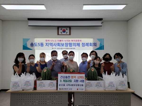 이번 지원은 무더위에 취약한 저소득층 고령의 어르신들이 보양식을 먹고 더운 여름을 잘 이겨내시도록 돕기 위한 송도5동 지역사회보장협의체의 ‘건강충전 행복 삼계탕 및 계절과일 지원 사업’의 일환으로 진행됐다.