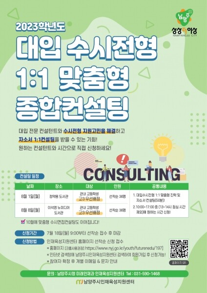 컨설팅은 8월 1일 정약용도서관, 8월 8일 이석영뉴미디어도서관에서 오프라인으로 진행되며 관내외 대입전문가를 초빙해 수험생의 수시전형 지원전략 및 자기소개서 컨설팅을 무료로 제공한다.