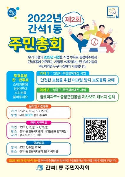 투표 방식은 온·오프라인으로 진행되며 QR코드를 통한 온라인 투표나 간석1동 행정복지센터 및 새마을금고 양지지점에서 진행되는 현장 투표로 참여 가능하다.