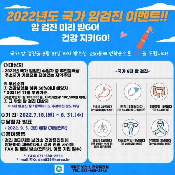 ‘암 검진 받GO 건강 지키GO’는 국민건강보험공단에서 실시하는 2022년도 국가 암 검진 수검자 중 주민등록상 주소지가 가평으로 되어있는 지역주민을 대상으로 실시하는 프로그램이며 7월 18일부터 8월 31일 까지 신청 기간동안 보건소에 검진 결과지를 제출한 선착순 250명에게 우산을 지급한다.