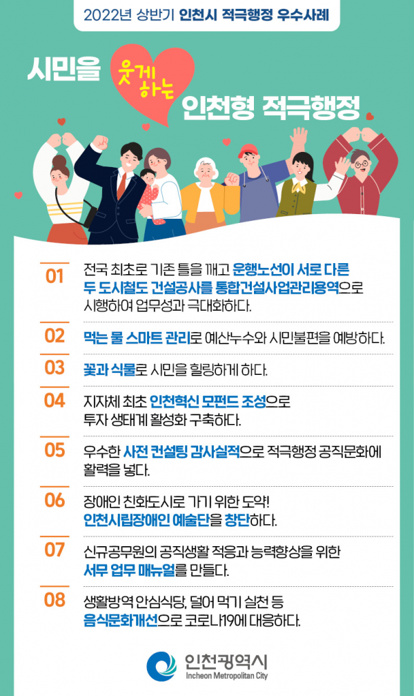 인천광역시는 적극적이고 창의적인 업무 추진으로 시정발전과 시민 편의증진에 기여한 공직자 8명과 부서를 2022년 상반기 적극행정 우수공무원·우수부서로 선정하고 포상을 실시했다고 밝혔다.