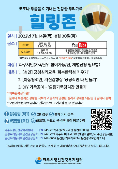 대면 프로그램은 7월 21일부터 8월 25일까지 매주 목요일 오후 2시부터 오후 4시까지이며 파주시 남부스마트복지센터 1층에서 진행하므로 참여를 원하는 시민은 8월 19일 금요일까지 센터 홈페이지에 신청하면 된다.