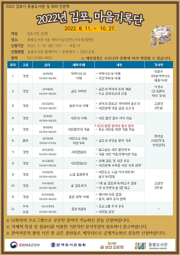 강좌 접수는 7월 19일 오전 10시부터 중봉도서관 홈페이지에서 가능하며 김포시민 20명을 선착순으로 모집한다.