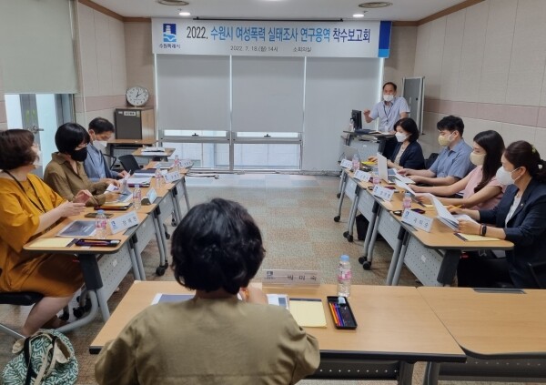 수원시는 18일 시청 소회의실에서 ‘여성 폭력 실태조사 학술용역 착수보고회’를 열고 실태조사 방향·방법 등을 논의했다.