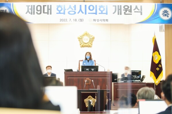 의원, 의회사무국 직원, 집행부 간부 공무원들이 참석한 가운데 열린 개원식은 의원선서와 의원윤리강령 낭독, 신임 김경희 의장의 개원사와 정명근 화성시장의 축사 순으로 진행됐다.
