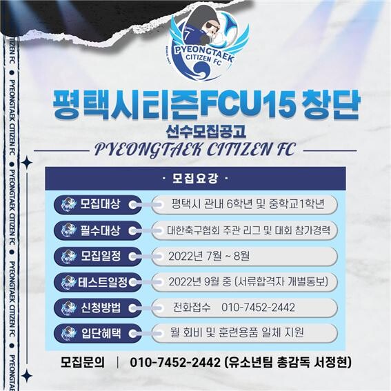 평택시티즌FC는 대한민국을 빛낼 선수 발굴과 육성을 위한 U-15 유소년팀 창단에 앞서 선수 선발 공개테스트를 실시한다고 밝혔다.
