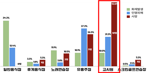 고시원 화재는 전체 26개 다중이용업소 가운데 화재발생 비율이 높은 것은 아니지만 화재 발생 시 인명피해로 이어지는 경우가 많아 효과적인 안전대책이 필요하다.