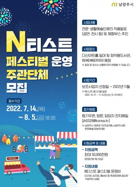 ‘N티스트 페스티벌’은 오는 10월 27일부터 11월 6일까지 11일간 다산아트홀, 정약용도서관, REMEMBER 1910 등 남양주시 내 문화 예술 시연 공간에서 진행되며 다양한 공연 및 전시, 체험 부스가 함께 운영돼 시민들의 문화 욕구를 충족시킬 예정이다.
